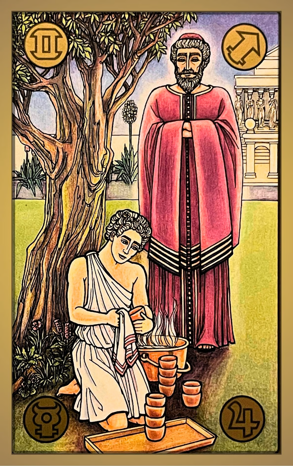 The [Sagittarius + Jupiter] combination is often called The Sage. Symbolon calls it The Preacher. Though the clerical robes and central cross might suggest a Christian minister, the context is ancient and medieval, where philosophy, religion, and science were inseparable.